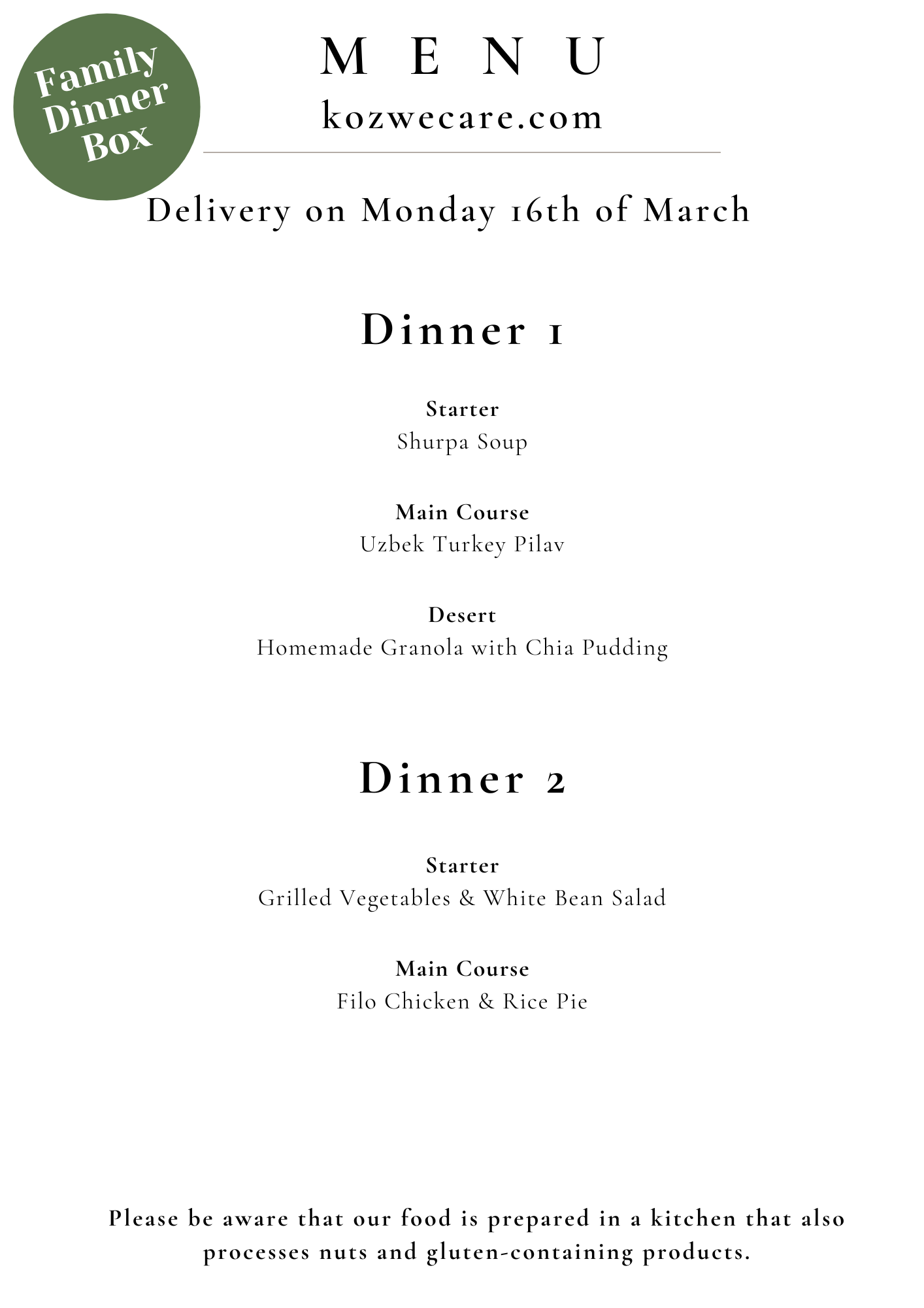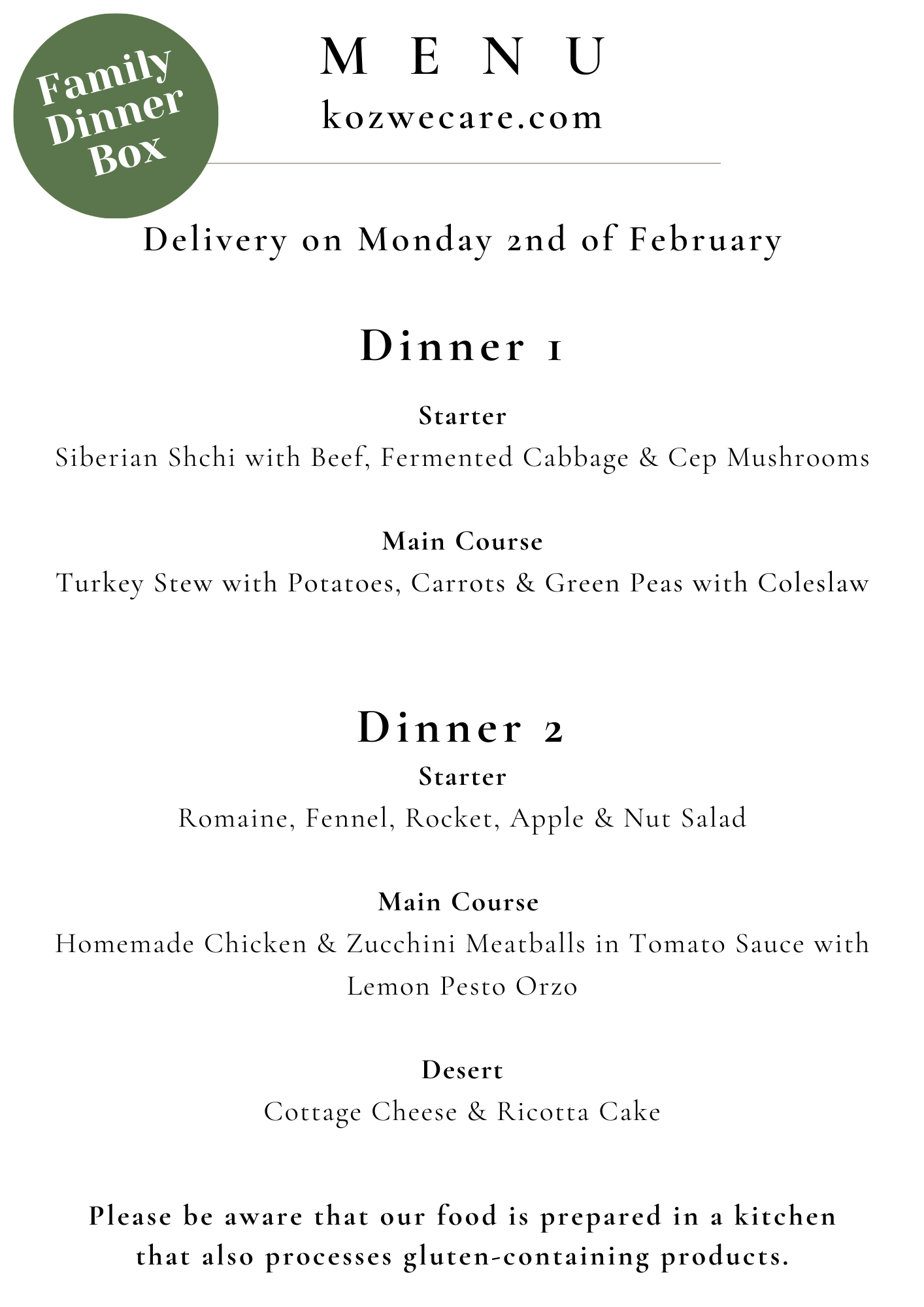 Our Family Dinner Box includes two dinners and is delivered on Monday evening.